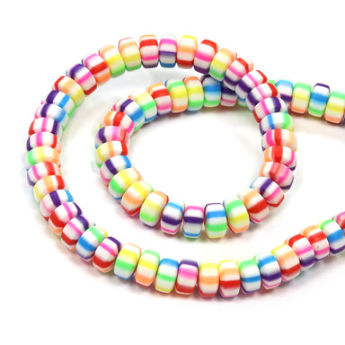 Beautiful bright rainbow stripy polymer clay drum beads. Approximately 110 beads per strand