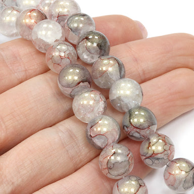 Gorgeous crackled glass beads with a gold coating. A string of approximately 84 beads. Material: Glass Shape: Round Size: 10mm Colour: Grey and R...
