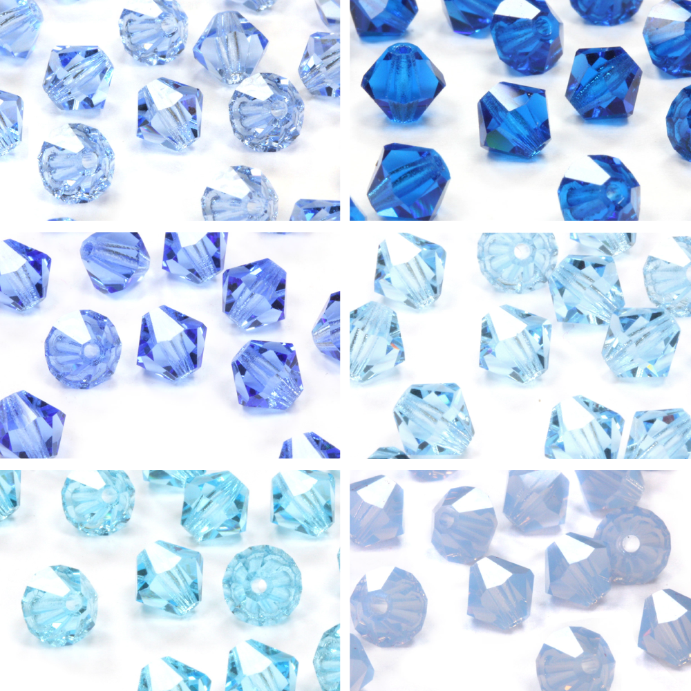 A fantastic bundle of 5mm Preciosa Crystal Bicone beads, 144 beads in total, 6 tonal blue colours, 24 beads of each colour; Capri Blue, Sapphire, Light Sapphire, Aquamarine, Aqua Bohemica and Light Sapphire Opal.