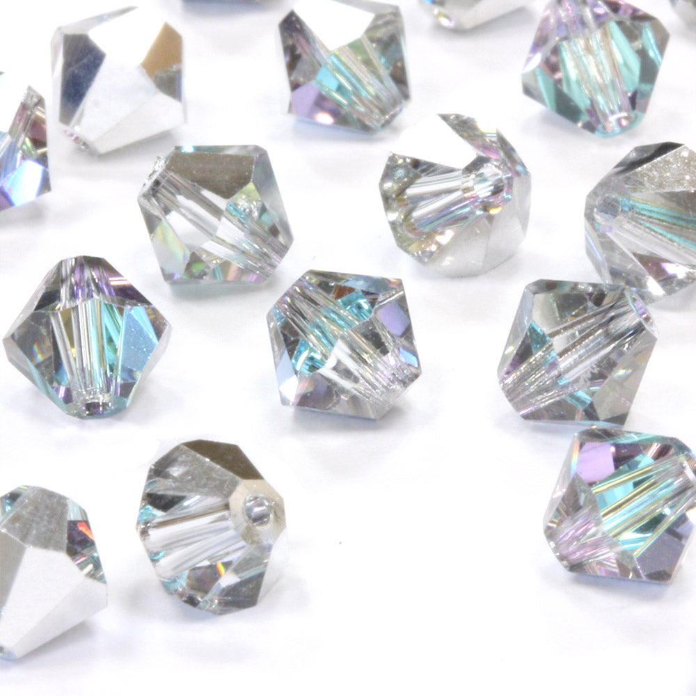 A fantastic bundle of 6mm Preciosa Crystal Bicone beads, 72 beads in total, 7 colours, 12 beads of each colour; Jet, Jet AB, Crystal, Crystal AB, Vitrail Light, Vitrail Medium, White Opal