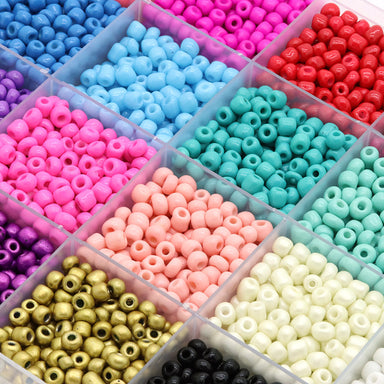 A fabulous selection of bold 4mm seed beads, 15g of each colour all in a handy storage box. These beads are irregular in shape, making them perfe...