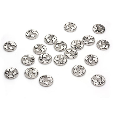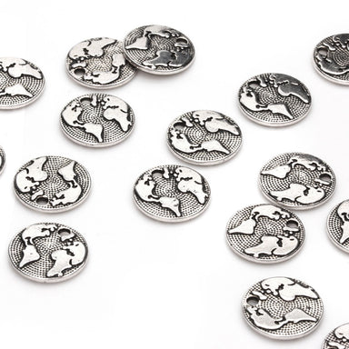 A wonderfully detailed flat globe Material: Zinc Alloy - nickel lead and cadmium free Colour: Silver Finish: Antique Silver Size: 15mm Hole Size: ...