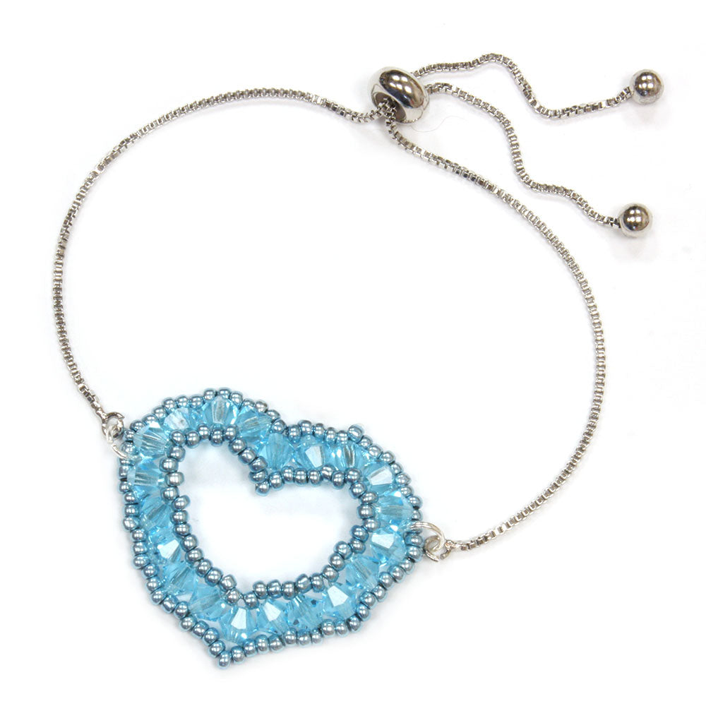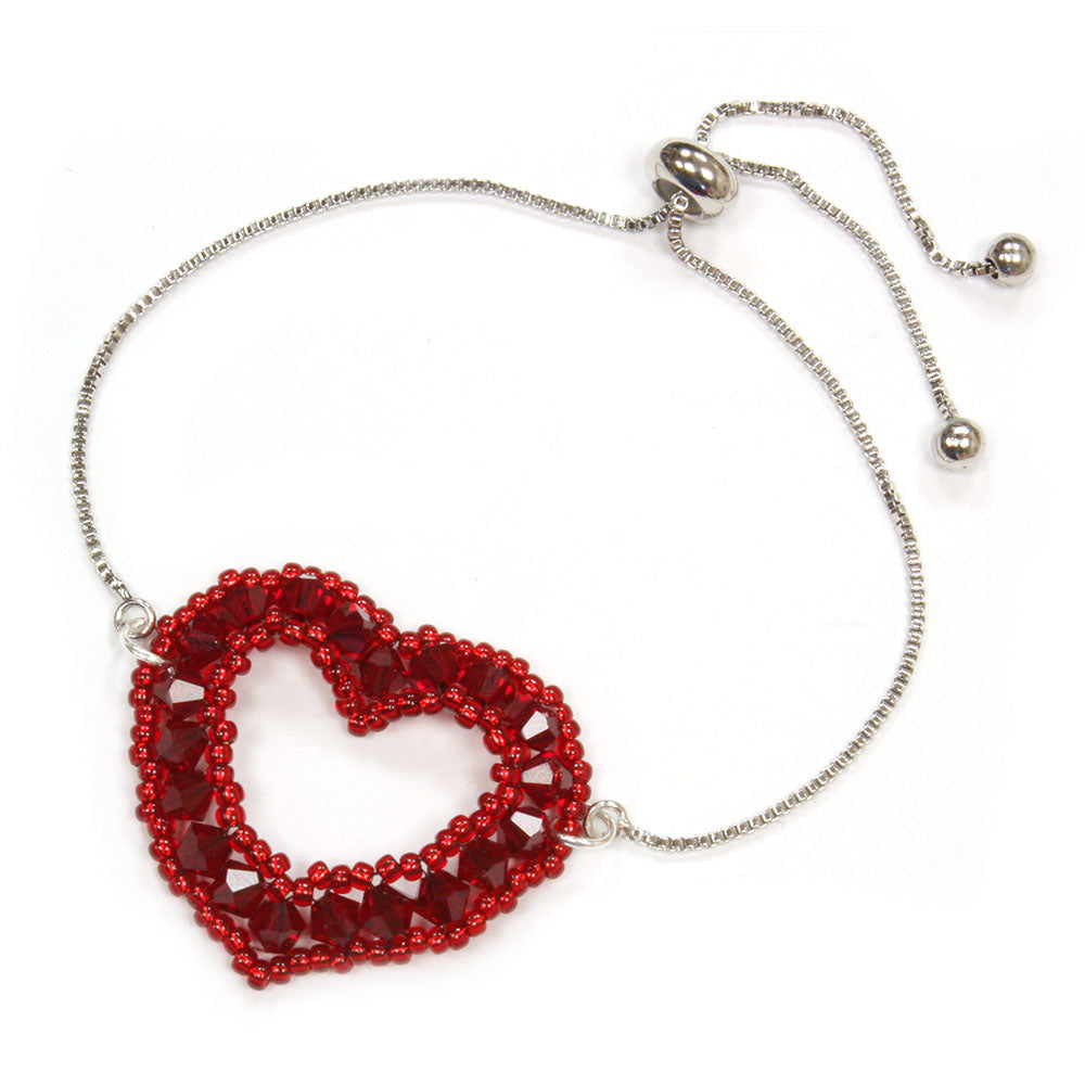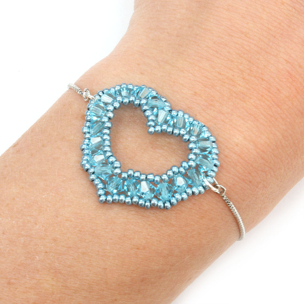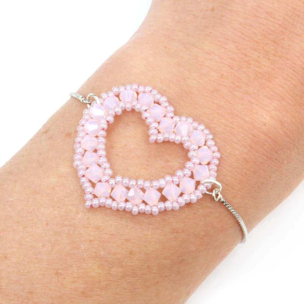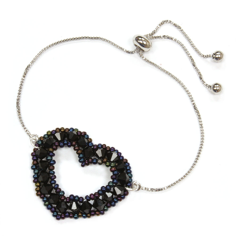 A contemporary sliding heart bracelet, featuring beautiful sparkling crystal beads. An intermediate bead weaving project using right angle weave.
