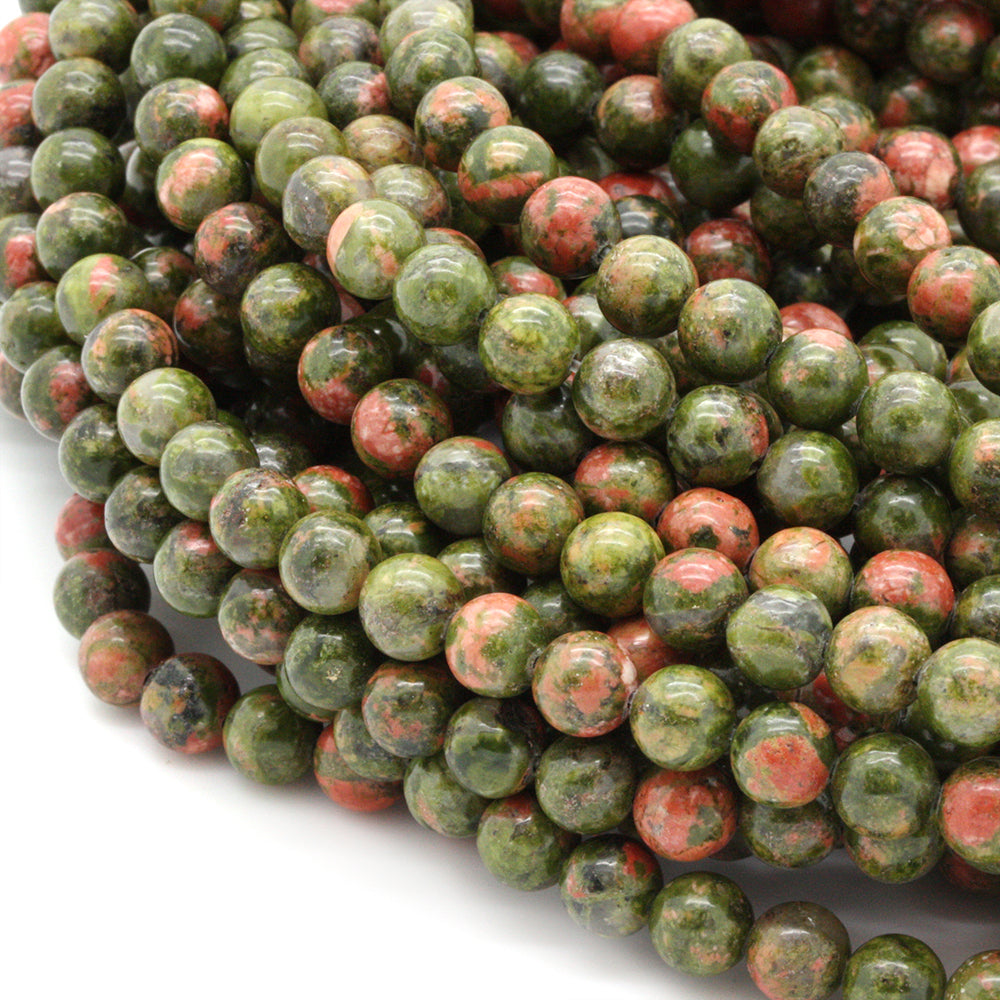 Unakite is a naturally occurring stone that is found in various places such as the United States, South Africa, Brazil and China. It is mainly composed of quartz, orthoclase feldspar and epidote which gives it it's unique pink and green colour. Please remember our semi-precious beads will all include natural inclusions and slight variations of colour. Of course this makes them even more unique as no two semi-precious beads are exactly the same. Approximately 35cm String.